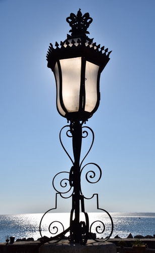 Tag: lampione, cielo, mare, vetro, ferro, azzurro, controluce, spirali, luce, acqua, riflesso, metallo, corona, orizzonte.