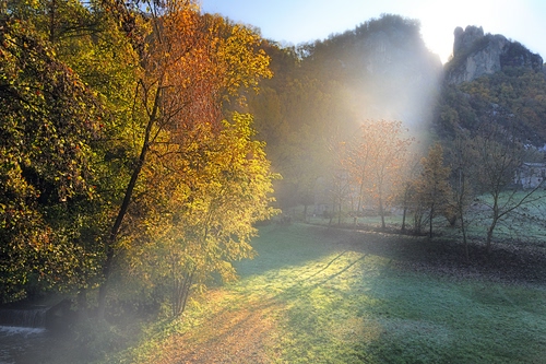 Tag: alberi, luce, verde, autunno, sole, raggio, prato, giallo, rosso, foglie, cielo, rami, erba, raggi, colori, natura, controluce, nebbia.
