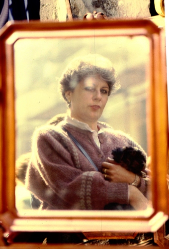 ho fotografato mia moglie che si specchiava in un vecchio specchio in un mercatino delle pulci, con in braccio il nostro yorkshire