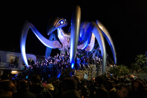 Viareggio 2014, ultima serata: ecco il carro vincitore, si festeggia a bordo de “La rete” di Alessandro Avanzini, che ha ricevuto anche uno speciale premio per l’innovazione. L’imponente, ipnotico cyberagno è un monito verso la voracità di Internet che ci priva della personalità e contro le insidie della rete.