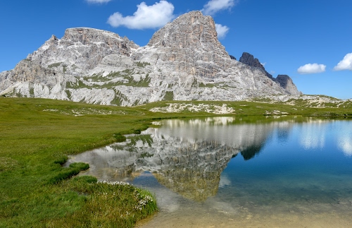 Tag: nuvole, cielo, lago, montagna, verde, riflesso, prato, acqua, erba, azzurro, riflessi, rocce, roccia, bianco, laghetto, paesaggio, vette, montagne.