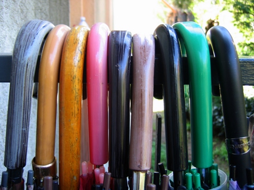 I manici di nove ombrelli appesi ad una ringhiera.