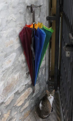 Ombrello multicolore sovrastante un gatto dall'aria un po' diffidente (è scappato via due secondi dopo lo scatto).