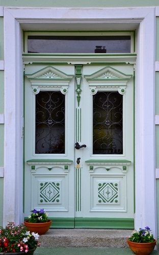 Tag: porta, vasi, verde, fiori, vetri, maniglia, bianco, portone.