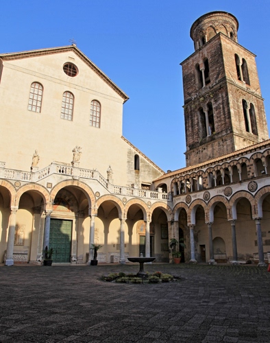 ...all'ombra dei portici e dentro l'urne confortate dal pianto è forse il sonno della morte men duro? ...Duomo Cattedrale di Salerno, un angolo del quadriportico con le urne secolari dei vescovi custodite sotto il porticato.