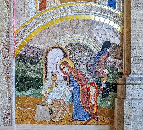 Bra - mosaico dell'artista e gesuita Marko Ivan Rupnik. Situato nella pareta alla destra del portale: rappresenta la Vergine Maria che si prende cura della madre Egidia che ha partorito un bambino. Dietro il piccolo Gesù che con la mano scaccia i soldati.