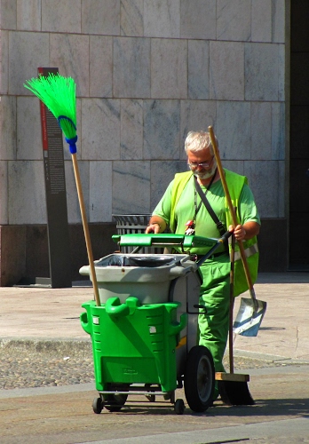 Tag: verde, uomo, scopa, paletta, strada, carrello, mestiere, spazzino, netturbino, bidone, ruote, pala, scope, divisa, ruota, ramazza, occhiali, grigio, muro, operatore.