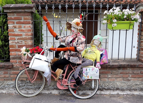 Tag: bicicletta, pupazzi, fiori, borsa, vaso, rosa, cancellata, rosso, verde, bianco, ruote, cappello, bici, cappelli, borse, muretto, porta, due.