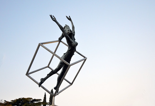 Tag: statua, donna, cubo, cielo, braccia, alberi, scultura, monumento, azzurro, volo, volare, gambe, ferro, corpo.