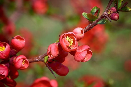Tag: fiori, ramo, boccioli, petali, rosso, foglie, primavera, verde, macro, stami, pistillo, albero, sfocato, pesco, rossi, giallo, spine, rosa.