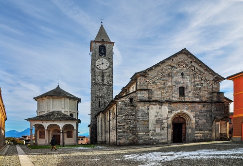 Tag: orologio, campanile, chiesa, piazza, nuvole, cielo, cappella, archi, pietra, battistero, colonne, portico, porte, case, azzurro, portone, finestre.