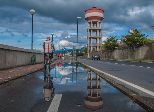 Tag: strada, alberi, nuvole, lampioni, riflessi, ciclista, cielo, riflesso, bicicletta, acquedotto, pozzanghera, biciclette, cisterna, auto, torre, acqua, serbatoio, pedoni, strisce.