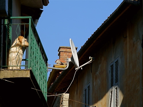 Tag: cane, antenna, balcone, finestre, verde, cielo, comignolo, case, persiane, azzurro, parabola, ringhiera, animale, via, ferro.