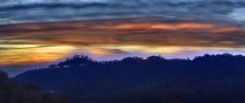 tramonto visto dalla galbusera bianca sopra la collina di montevecchia e relativo santuario