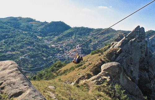 La partenza da Pietrapertosa. Sullo sfondo Castelmezzano, punto di arrivo.