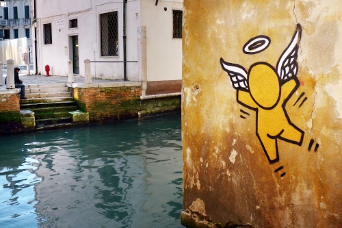 Tag: acqua, angelo, canale, finestre, murales, muro, giallo, scala, scalini, graffito, aureola, disegno, case, porta, ali, gradini, graffiti, venezia, persona, murale.