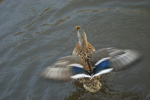 @Diana: se si stesse posando, si vedrebbe l'inizio dei cerchi concentrici che si formano quando un soggetto tocca la superficie di un liquido. Quando un volatile decolla invece, si vedono le increpature d'acqua irregolari e basta.