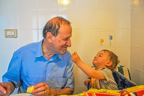 amore, tenerezza tra nonno e nipotino., Nonno ora ti do io da mangiare