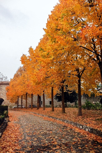 Tag: foglie, alberi, autunno, strada, arancione, tronchi, giallo, viale, rami, automobili, muro, giardino, cielo, ottobre.