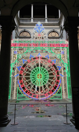 Una grande installazione luminosa di Marinella Senatore a palazzo Strozzi