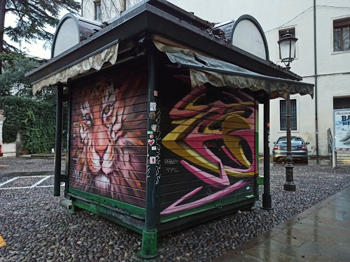 Tag: lampione, edicola, murales, tende, albero, automobile, finestre, auto, verde, leone, bagnato, serrande, graffiti, tenda, tigre, macchina, case, acciottolato, astratto, rami.