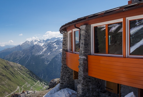 Tag: finestre, neve, montagna, montagne, strada, rifugio, arancione, cielo, paesaggio, tornanti.