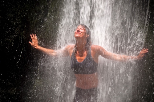 Tag: costume, acqua, cascata, donna, ragazza, doccia, sensazione, braccia, mani, getto, freschezza, spruzzi, nero, zampilli, luce, reggiseno, sorriso, schizzi.