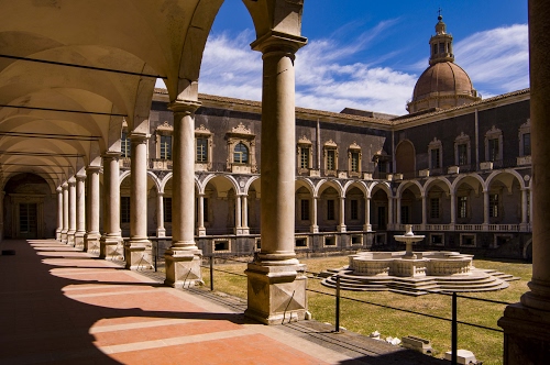 Tag: colonne, fontana, archi, cupola, finestre, chiostro, portico, nuvole, portici, porticato, cielo, prato, verde, cortile, azzurro, ombre, ombra, erba, capitelli, gradini.