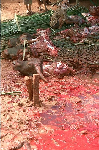 E'vero mi è sfuggito il piccolo bordo nero sulla sx. Siamo nell'isola di Sulawesi in Indonesia dove le cerimonie funebri sono cruente all'inverosimile, più il morto era importante più animali venivano sacrificati (in quell'occasione una decina di bufali più un numero imprecisato di maialini). Un po' troppo per una persona sensibile come me, ho dovuto gettare scarpe, calze e jeans intrisi di sangue e per tutto il prosieguo del viaggio, e oltre, ho dovuto prendere dei tranquillanti prima di addormentarmi. |