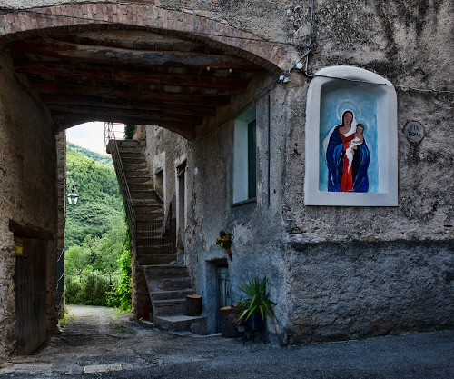Tag: madonna, edicola, scala, gradini, arco, verde, portico, lampione, finestre, pianta, scale, porte, scorcio, pietra, casa, muro, dipinto, azzurro, scalini, borgo.
