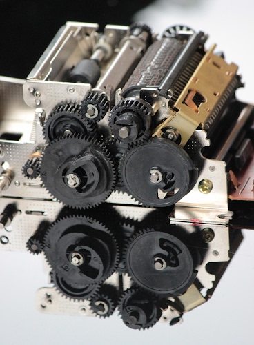 Ingranaggi di una stampante per calcolatrice elettromeccanica che, partendo dall'ingranaggio più piccolo a sinistra, calettato sul motore, trasmette il moto ad una serie di ingranaggi che movimentano i numeri, il nastro inchiostrato e l'avanzamento della carta.