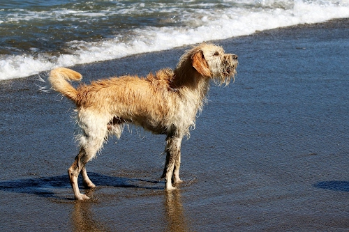 Tag: cane, mare, coda, pelo, acqua, onda, spiaggia, zampe, sabbia, bagnato, animale, bianco, riva, muso, battigia, onde, bagno, marrone, schiuma.