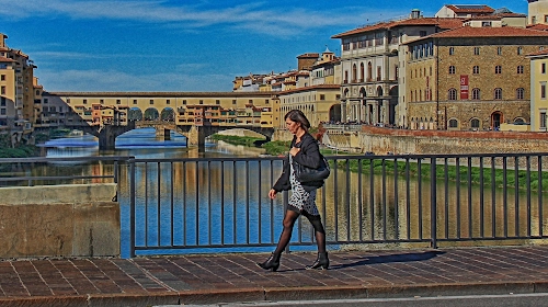 Tag: donna, ponte, fiume, ringhiera, firenze, camminare, palazzi, arno, borsa, acqua, case, archi, vecchio, azzurro, cielo, finestre, tetti, passante, cammina, città, passeggiare, riflessi.