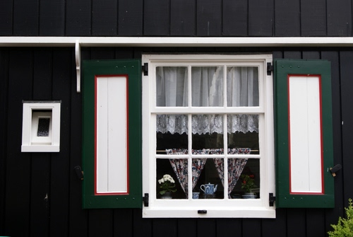 stipiti bianchi, imposte verdi bordate di rosso, sul davanzale un vaso di fiori ed una caffettiera decorata...tendine con pizzo e tendine colorate, una fantasia tutta nordica.