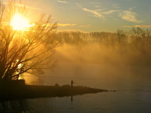 Tag: alberi, pescatore, lago, alba, sole, nebbia, tramonto, acqua, nuvole, cielo, rami, albero, raggi, inverno, controluce, pesca, foschia.