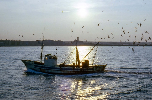 Tag: uccelli, mare, barca, peschereccio, sole, gabbiani, acqua, controluce, cielo, alberi, volo, costa, scia, riflesso, imbarcazione, luccichio, cabina.