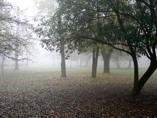 Tag: alberi, foglie, nebbia, rami, tronchi, autunno, parco, erba, verde, grigio, autunnale, giardino, marrone, bosco.