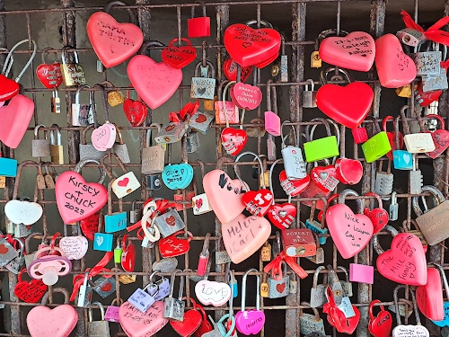 Tag: lucchetti, rosa, rosso, verde, rete, cuori, ottone, ferro, azzurro, scritte, parole, cuore, lucchetto, metallo.