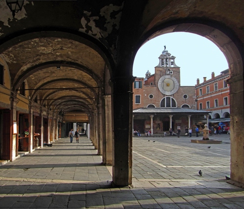 Siamo a Venezia: la Serenissima! Forse la città più fotografata del Mondo! L'immagine è suggestiva e racconta due ambienti attigui ma con luminosità molto diverse: la piazza con la luce diretta del giorno ed il porticato sulla sinistra, dove la luce è quella che filtra tra le colonne del porticato. La bravura del fotografo è quindi doppia: da una parte affronta la difficoltà di "mediare" le diverse intensità di luce in una unica inquadratura, e dall'altra l'inquadratura è stata studiata per dare un equilibrio alle due parti dello scatto, che risultano quasi perfettamente simmetriche nelle proporzioni. Ulteriore difficoltà immagino sia stata quella di trovare un momento in cui non ci fossero le solite folle straripanti (siamo nei pressi del famosissimo e visitatissimo Ponte e mercato di Rialto. In definitiva: chapeau! |