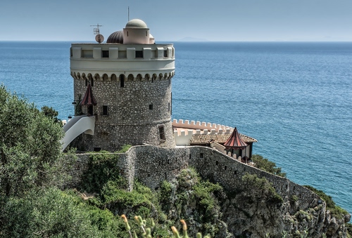 Tag: mare, torre, acqua, verde, azzurro, castello, panorama, cielo, finestre, merli, mura, alberi, cupola, fortezza, cupole.