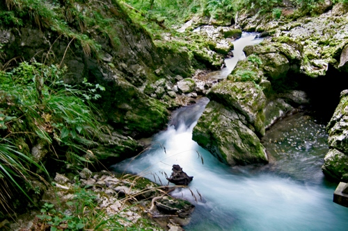 In uno splendido scenario naturale il torrente Vintgar dalle acque limpidissime scorre impetuoso.