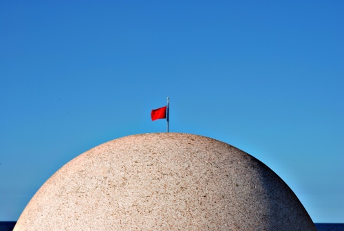 È un "panettone" che blocca l'ingresso ad una spiaggia ripreso da vicino, con la bandiera rossa che spunta da lontano ...