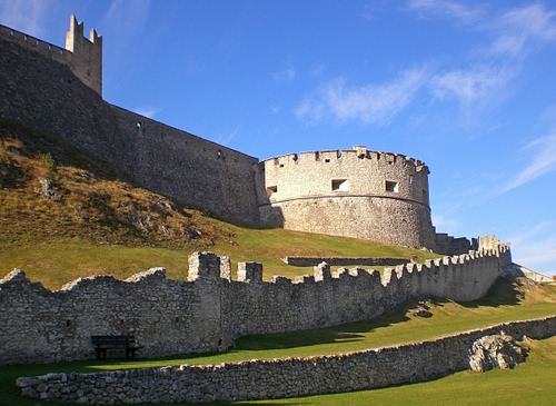Tag: castello, torre, merli, mura, verde, cielo, fortezza, prato, finestre, panchina, azzurro, torrione, nuvole, pietra.