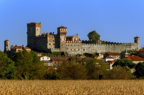 Tag: alberi, castello, torri, merli, campo, cielo, campanile, case, mura, grano, verde, granoturco, azzurro, finestre, paese, paesaggio.