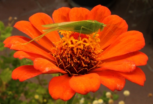 Cavalletta verde su fiore arancio.