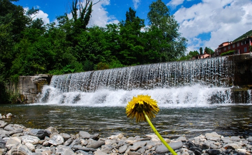 Tag: fiore, cascata, giallo, acqua, fiume, sassi, alberi.