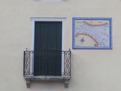 Tag: meridiana, balcone, ringhiera, porta, finestra, muro, imposte, orologio.