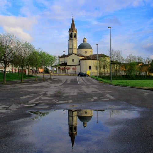 Tag: chiesa, riflesso, pozzanghera, campanile, cielo, alberi, cupola, acqua.