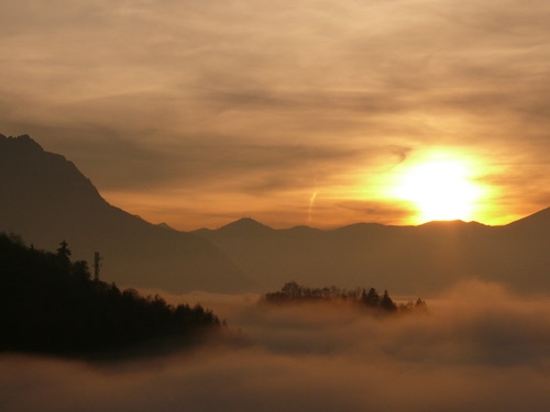 Tag: nebbia, sole, montagne, tramonto, nuvole, alberi, colline, panorama, alba, monti.