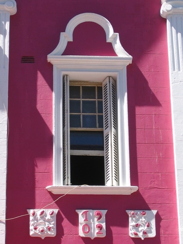Finestra di una casa di Cape Town (Sud Africa), risalente al 1902, come indica uno degli stemmi nella parte bassa della foto.